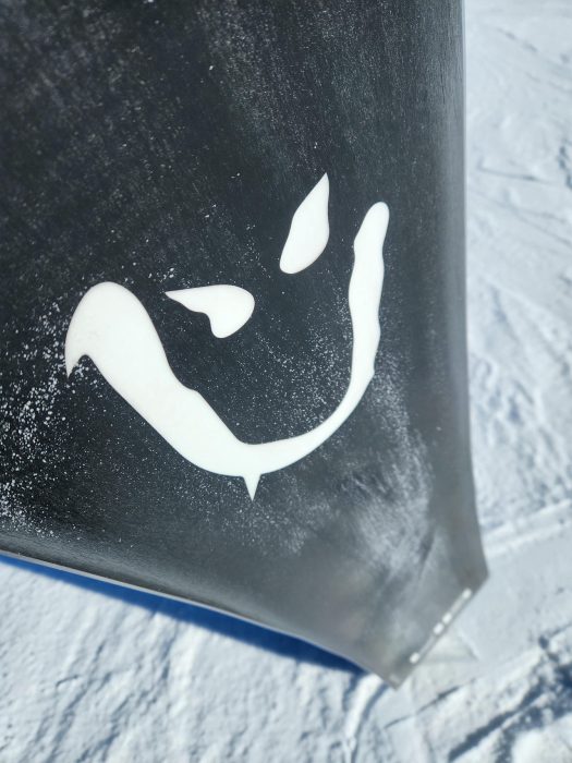 If you aren’t looking at it up close or on a sunny day, the graphics of the dPr won’t look like much. It’ll just look like a black Lib Tech board with a smiley face on its base.