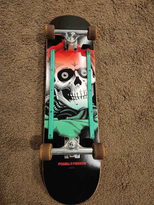 I skated the Powell Peralta Ripper skate deck in size 242. This is an 8″ wide deck by 31.45″ long, with a 14″ wheelbase.