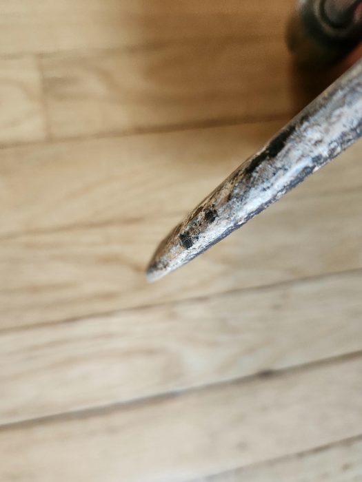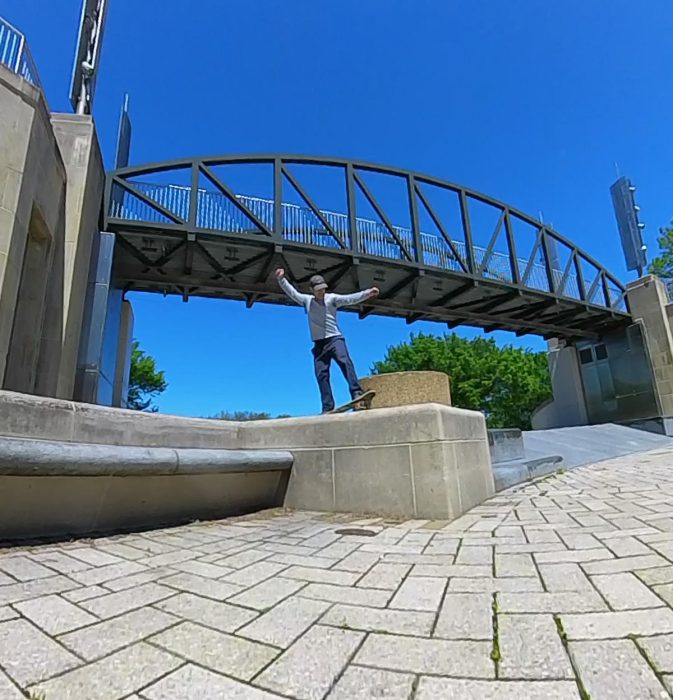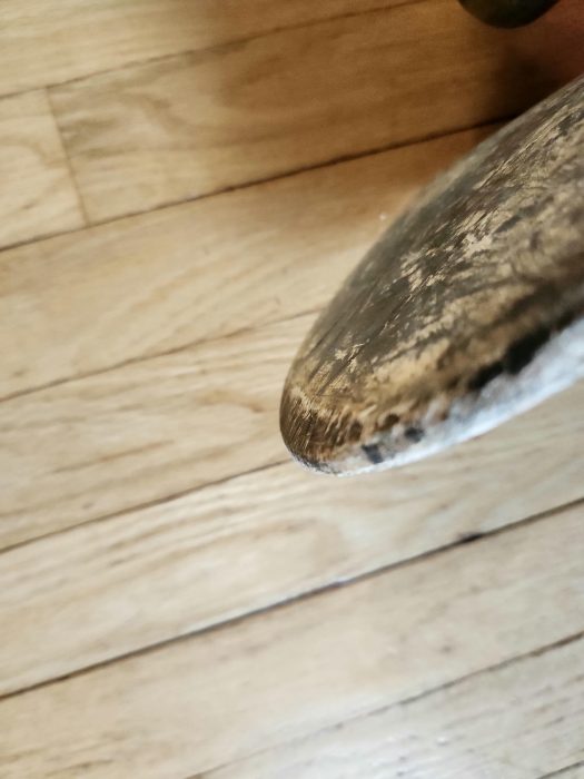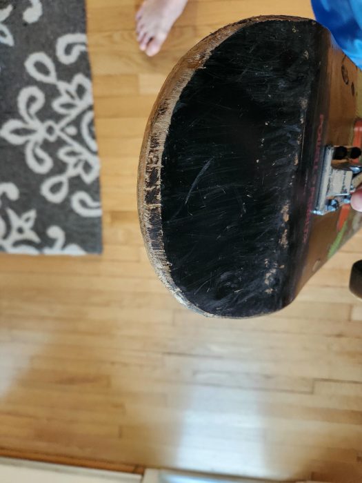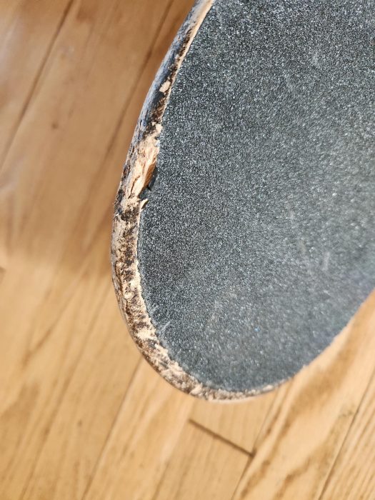 While the deck itself is durable and feels good, it chips fairly easily. The second time I skated it, a chunk of my nose splintered off. Then, towards the end of the board’s life, I dented the entire side of the deck when trying to heelflip into a ledge with coping on it. I didn’t get high enough to get on the cub and landed primo right on the edge. That left this mark.